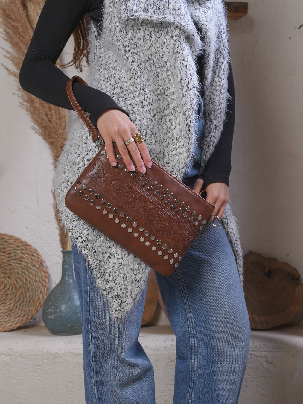 The Aurora Clutch blends artistry with sophistication — designed with embossed details and golden studs that catch the light just like the aurora itself.