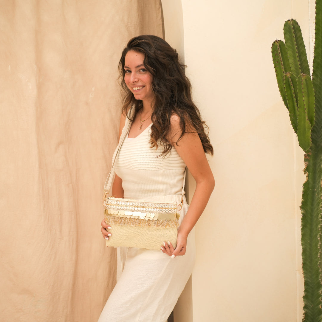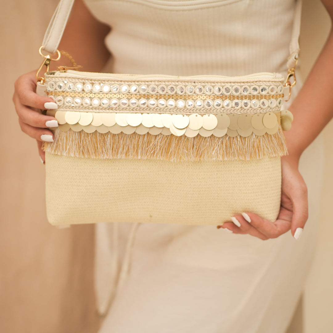 Turn heads with Lustra — a radiant crossbody clutch designed to shine. Handcrafted from soft, skin-friendly straw material, this lightweight beauty features mirrored embellishments, golden sequins, and playful fringe detailing. Its coastal charm meets boho glam, making it the perfect accessory for everything from beach getaways to city brunches. Easy to pair with any outfit, Lustra adds a stylish, elegant touch wherever you go. Perfect for travel, casual days, or sun-soaked escapes — carry your glow in effortless style.