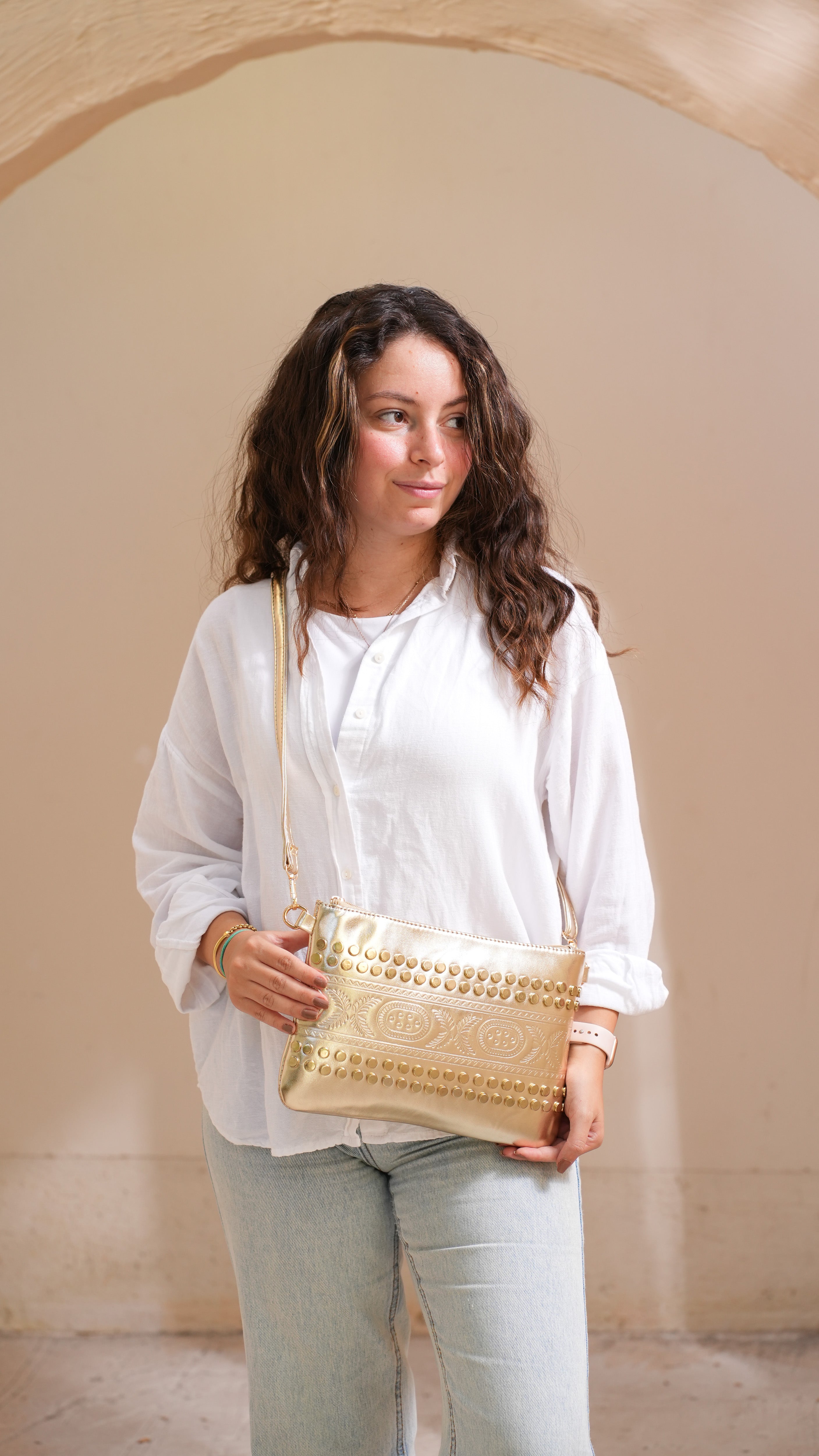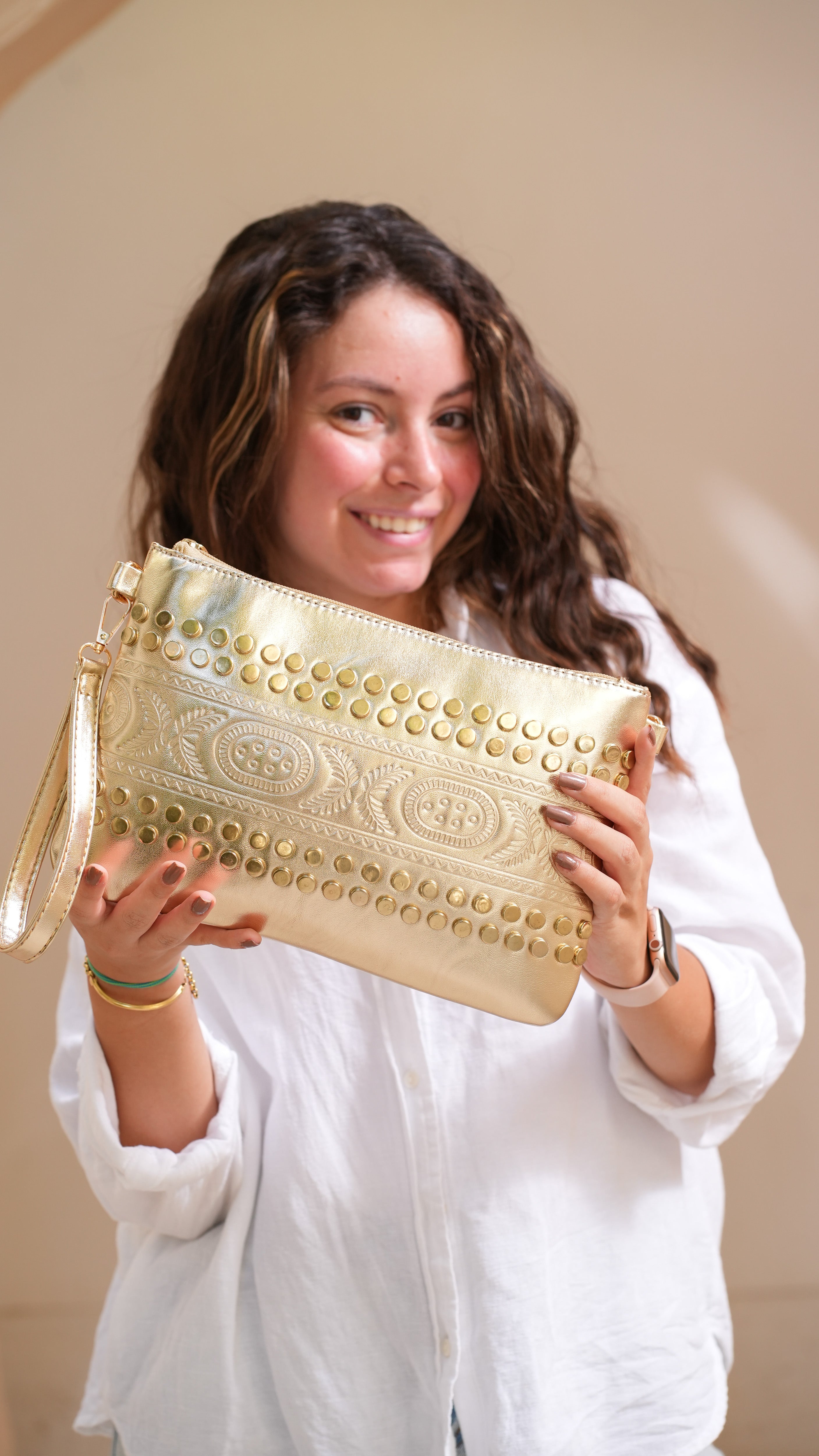 The Aurora Clutch blends artistry with sophistication — designed with embossed details and golden studs that catch the light just like the aurora itself.
