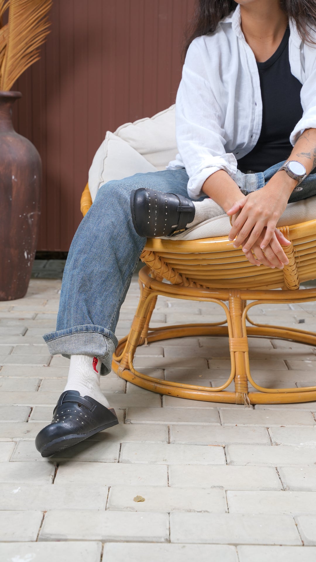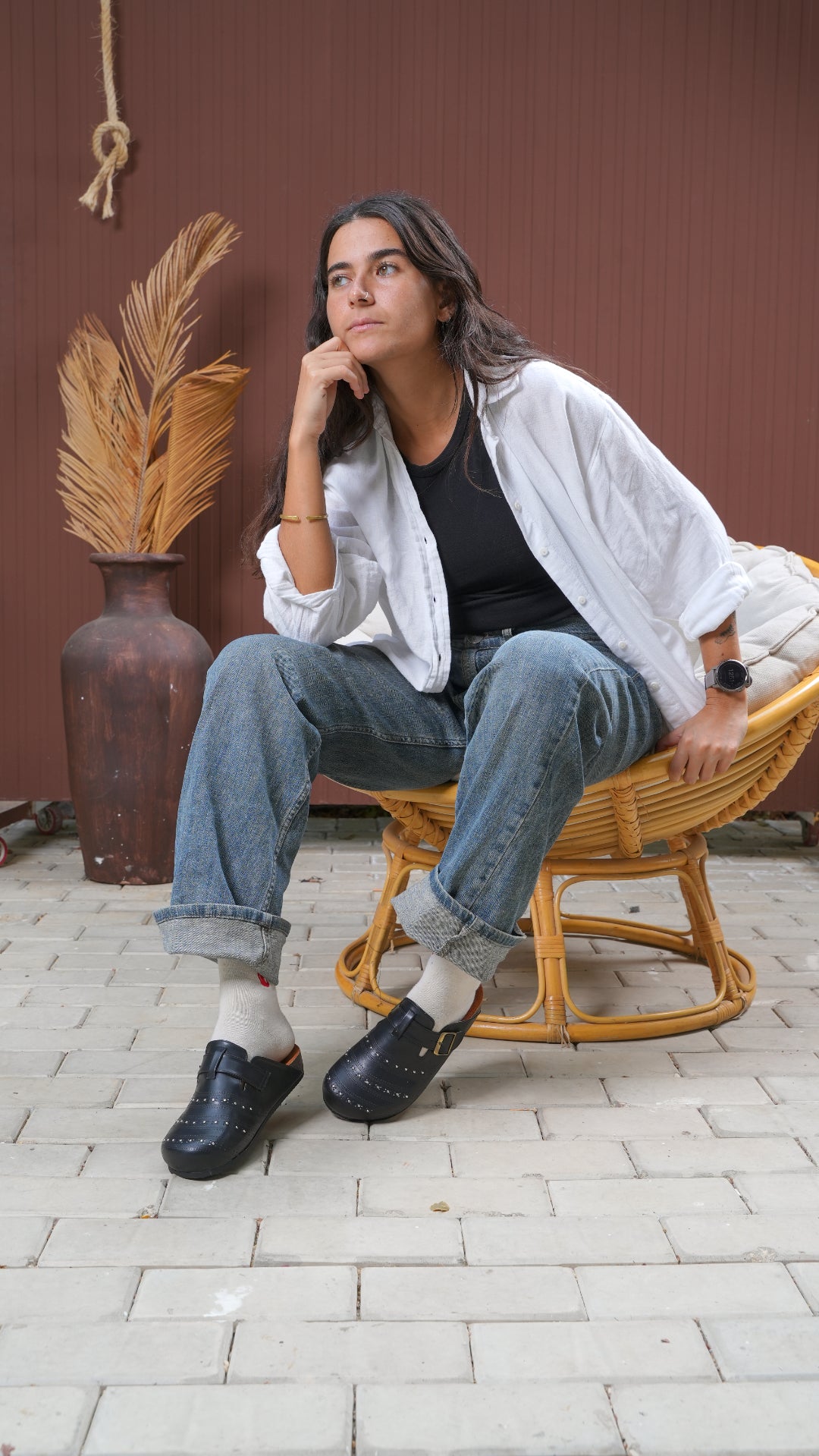The Ciela Clogs bring together a soft Leather feel, a clean buckle detail, and a full sprinkle of metallic studs that add a modern spark to a classic shape. They slip on easily, hug the foot comfortably, and keep every step light thanks to their cushioned sole. A statement piece that works for daily outfits and dressed-up moments without depending on any specific color.