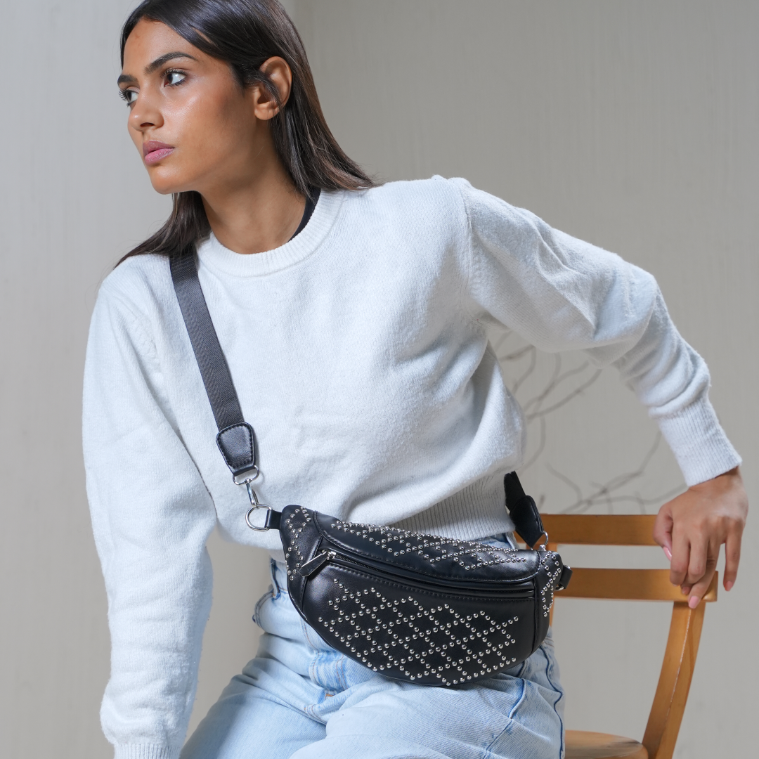 A statement belt bag designed for hands-free confidence and style. Crafted from premium leather and finished with full-surface metallic studs, it brings a bold, modern edge to any outfit. The spacious main compartment keeps your essentials secure and easy to reach, while the adjustable strap lets you wear it around the waist or across the chest. Durable, stylish, and effortlessly cool — the perfect everyday piece with a strong attitude.