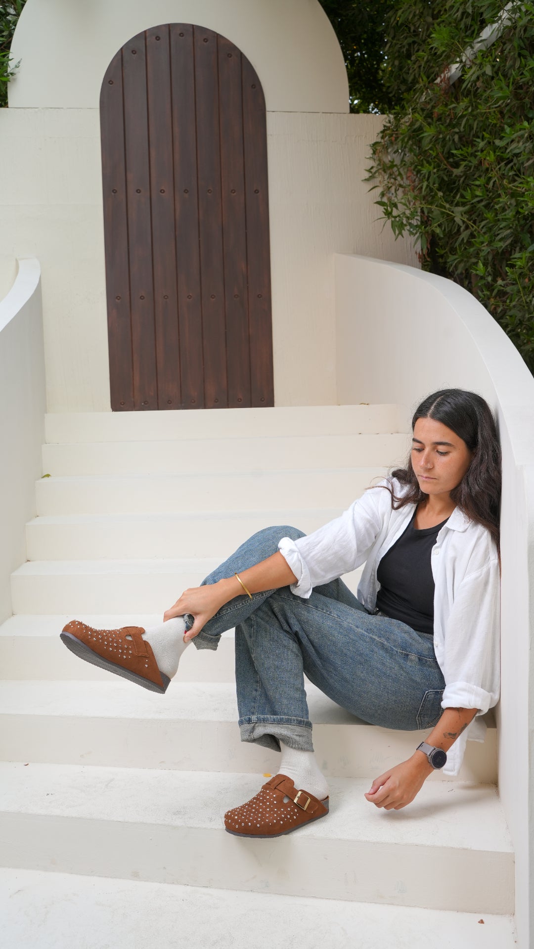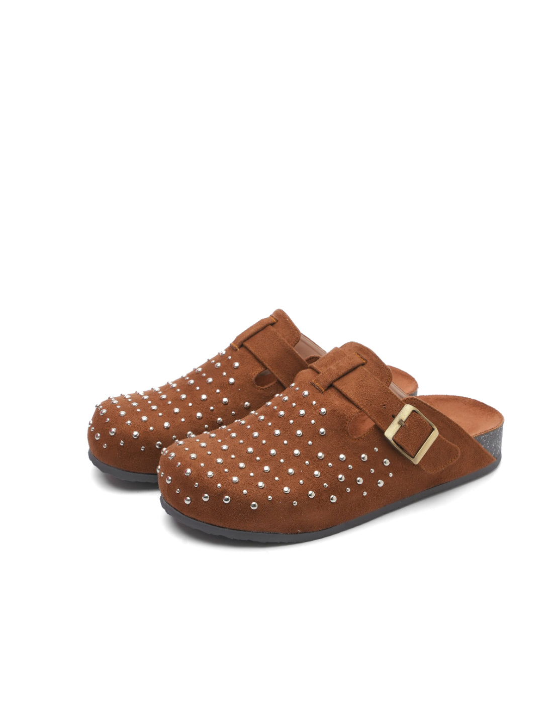 The Stud Clogs bring together a soft suede feel, a clean buckle detail, and a full sprinkle of metallic studs that add a modern spark to a classic shape. They slip on easily, hug the foot comfortably, and keep every step light thanks to their cushioned sole. A statement piece that works for daily outfits and dressed-up moments without depending on any specific color.